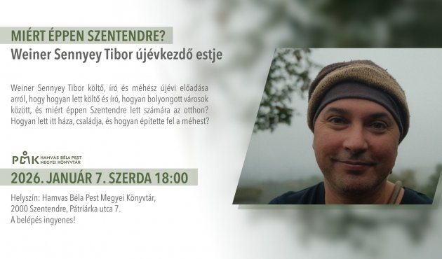 Weiner Sennyey Tibor költő, író és méhész újévi előadása arról, hogy hogyan lett költő és író, hogyan bolyongott városok között, és miért éppen Szentendre lett számára az otthon? Hogyan lett itt háza, családja, és hogyan építette fel a méhest?