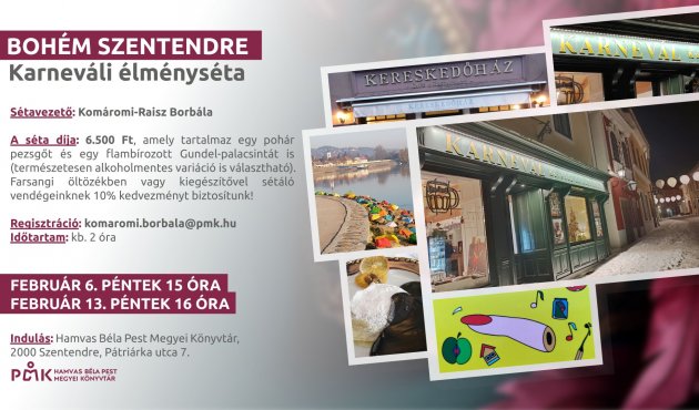 Ezen a különleges alkalmon helytörténeti érdekességeket tudhatunk meg városunk "karneváli" vonatkozásairól és bohém oldaláról. Amire számíthatunk: irodalom, képzőművészet, zene, gasztronómia... egy élménydús délután során.