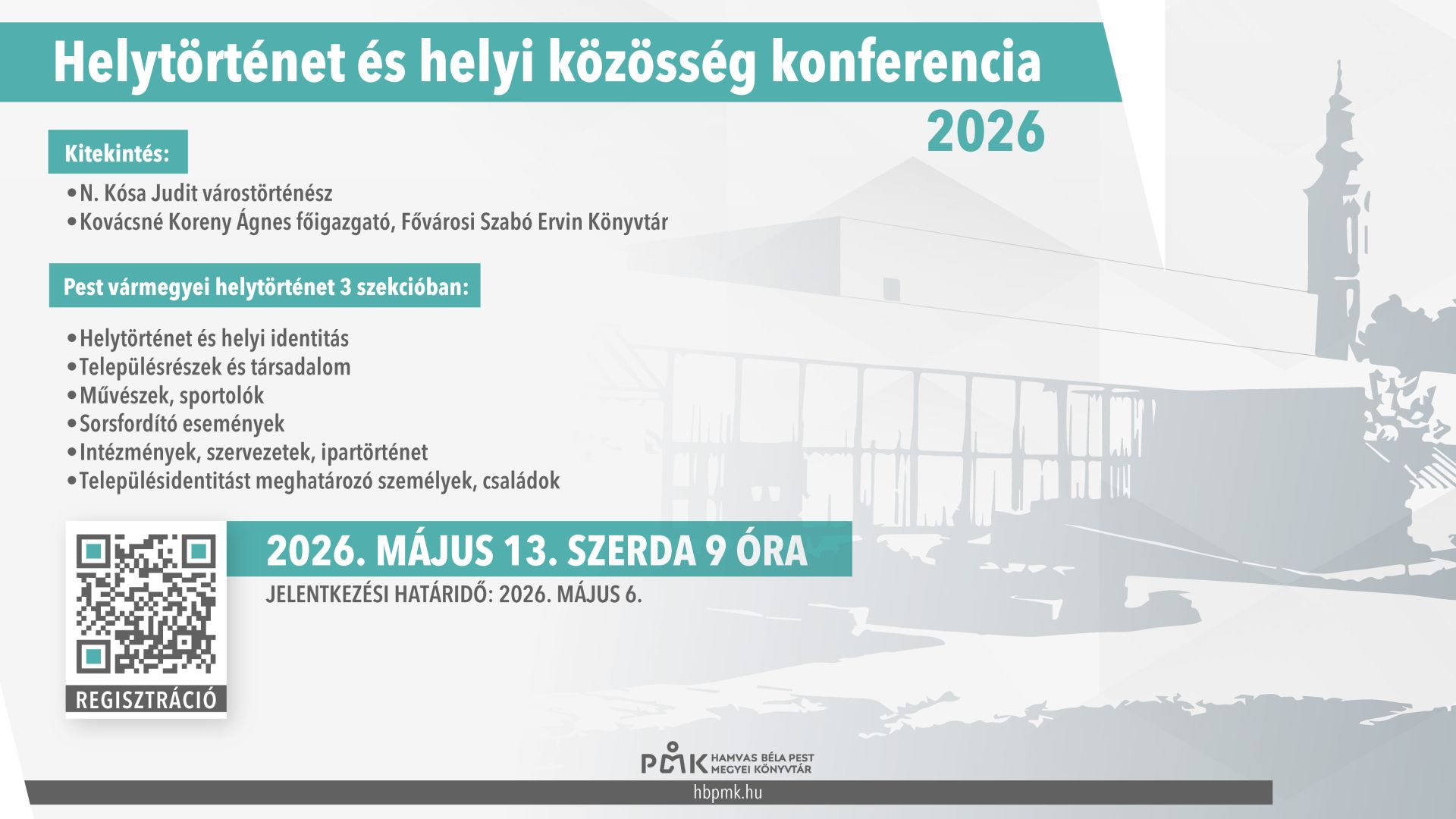 2026-ban újra megrendezésre kerül a Helytörténet és helyi közösség konferencia, amely immáron hagyományos programnak mondható ilyenkor tavasszal. Célunk továbbra is az, hogy lehetőséget teremtsünk az amatőr és a professzionális szinten helytörténettel foglalkozók számára kutatási területük bemutatására, a találkozásra, a tapasztalat- és eszmecserére. Szeretnénk, hogy a településük történetével foglalkozók a Hamvas Béla Pest Megyei Könyvtár segítségével megismerjék egymást, kapcsolatokat építsenek, hosszabb távon pedig közös projekteket kezdeményezzenek. Szeretnénk, ha azok a lokálpatrióták, akik szabadidejük terhére végeznek kutatásokat lakóhelyükről, személyesen is megismerkednének a megyei intézményhálózat szakembereivel, megismernék egymás kutatásait és keresnék a lehetőséget a közös munkára.