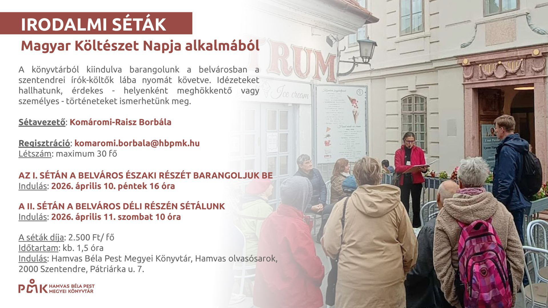 A könyvtárból kiindulva barangolunk a belvárosban a szentendrei írók-költők lába nyomát követve. Idézeteket hallhatunk, érdekes - helyenként meghökkentő vagy személyes - történeteket ismerhetünk meg.