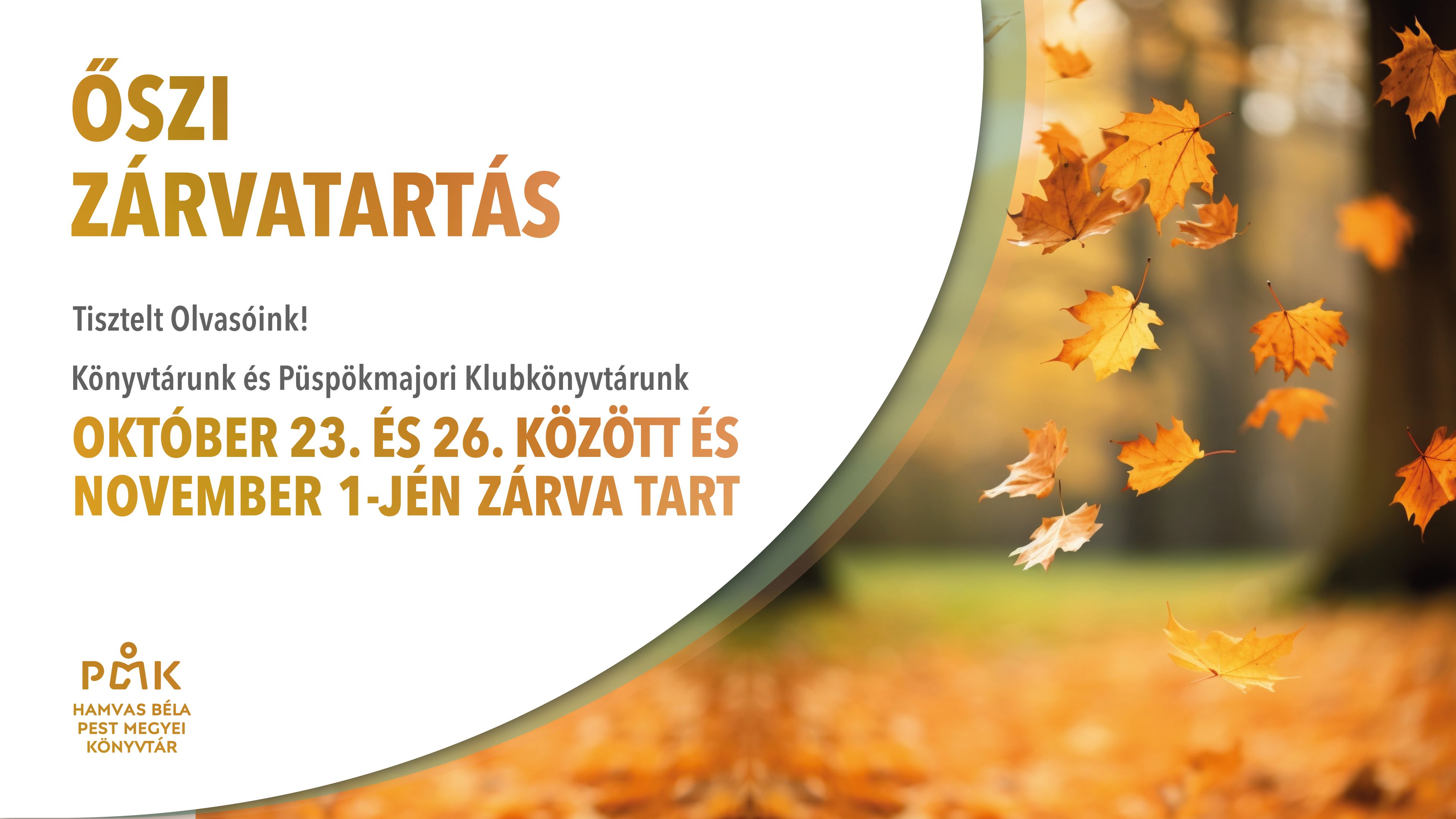 Tisztelt Olvasóink!Könyvtárunk és Püspökmajori Klubkönyvtárunk október 23. és 26. között és november 1-jén zárva tart.